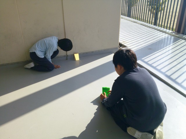 鏡で日光を跳ね返すことができると分かった3年生。次は、温かさも跳ね返った先に伝わるのか調べたくなりました。
