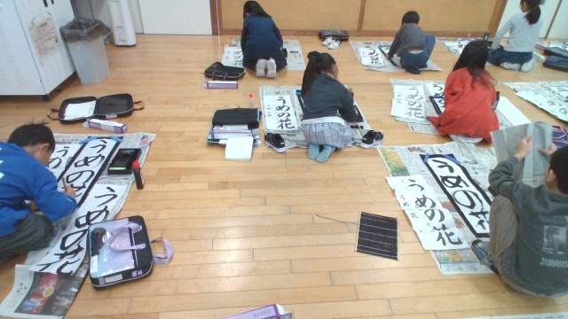 3年生は、「うめの花」という字に取り組みました。始筆や終筆、点画の太さや長さに気を付けて、真剣な表情で筆を動かす姿が見られました。