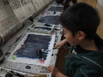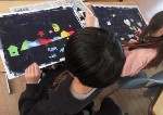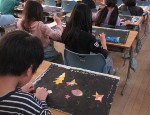 2年生 ステンシルローラー版画 その3 公開日 2026/02/07 更新日 2026/02/05 2年生のページ シールを貼り終えたら、黒色や藍色のインクを前面に塗ります。最後に、シールをそっとめくると、鮮やかな色が現れてきます。完成した作品を、みんなで見合いました。 +1