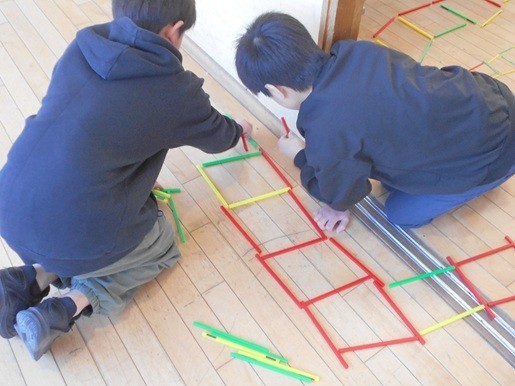 今日は、長さの等しい棒で正方形をつくり、横に並べたときの正方形の数と棒の数を調べました。
