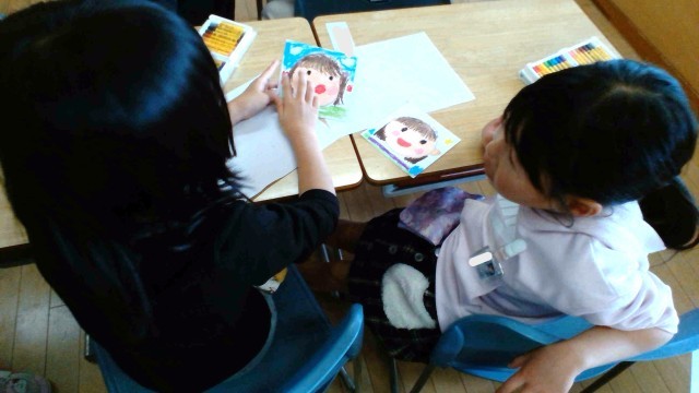 図画工作科では、自分の顔を描きました。友達と見せ合い、友達の絵の素敵なところを聴き合いました。