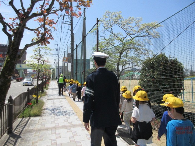 その後1年生は実際に道路で歩行練習を行いました。交差点だけでなく、お店の出入り口にも危険があることを実際に目で見て確認しながら安全な歩き方について学びました。