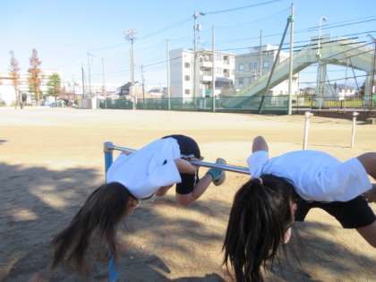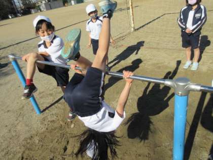 今日は、足かけふり、足かけあがり、さかあがりに挑戦しました。「おなかを鉄棒に近づけるといいよ!」「できるようになってよかったね」など、友達と声を掛け合って練習に取り組んでいる姿がとても素敵でした。
