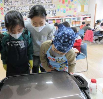 待ちに待ったポップコーン作りをしました。パチパチと弾けるポップコーンの音を聞いたり、ふくらむ瞬間を見たりして、子供たちはニコニコ笑顔!片付けも協力して行いましたよ。