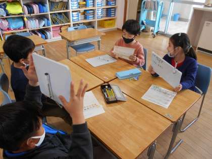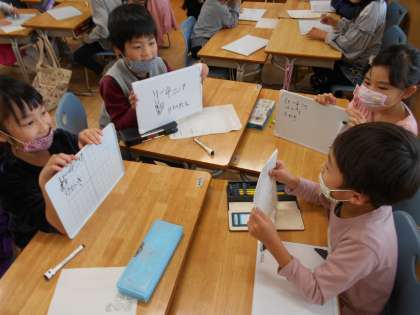 算数科の「ひきざん」の学習で、繰り下がりになる引き算の問題を作りました。「あさがおの問題」や「野球の問題」等、個性が光る問題を、グループで紹介し合いました。みんな、すらすら式と答えをかけるようになっています。