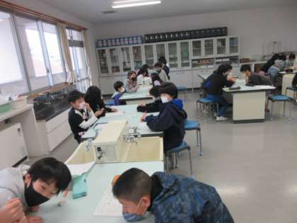 4年生では、現在とじこめた空気と水の学習をしています。空気の場合には、温められると体積は大きくなり、冷やされると体積が小さくなる結果から、水の場合を予想して行いました。実際に自分たちで行うことで、実験結果を見入っていました。
