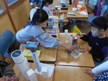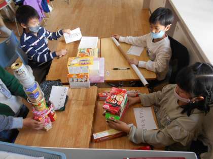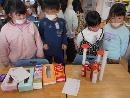 算数科の「かたちあそび」の学習で、形に着目して仲間分けをしました。それぞれのものの形の特徴を考えて、班で協力して「四角グループ」「丸グループ」等に分けました。最後は、色々な班の仲間分けを見て、「長い棒グループって面白い」「転がるグループもあるよ」等、自分たちでは気付かなかった形の特徴に気付いていました。