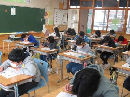 学期のまとめ週間に入り、2学期末のテストが始まっています。今日、5年生は理科のテストを実施しました。子供たちは、これまでの学習内容を復習し、目標の点数がとれるように、「全集中の呼吸」でテストに臨んでいました。来週は算数のテストを行う予定です。長かった2学期もいよいよ最終盤。もうひと頑張りです。