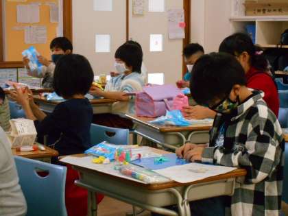 子供たちは図画工作の学習で、空き容器を紙粘土を使って変身させています。色を付けた紙粘土をこねたり、伸ばしたり、指で貼り付けたりしながら子供たちはカラフルな作品をつくっていました。