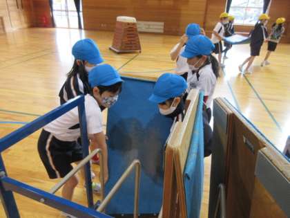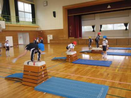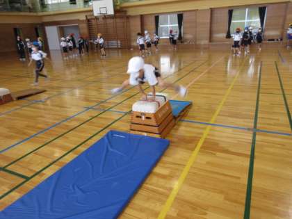 5段の跳び箱を跳んだり、いろいろな技ができるようになったりしています。安全に気をつけて、友達と協力し片付けています。
