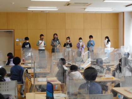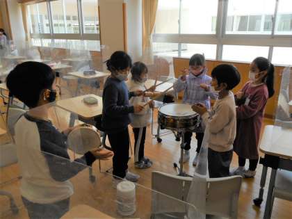 音楽の学習で、「かぼちゃ」という曲に合わせて楽器を演奏しました。一人、二人、三人と歌があるように、人数が増えるにつれて楽器の音がだんだん大きくなるように、演奏する楽器の順番を考えました。グループのみんなで協力した成果を発表し、友達のよいところをたくさん見つけることができました。