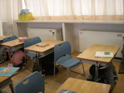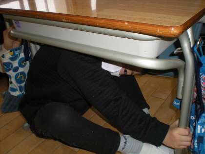読書タイムに避難訓練を行いました。今回は、「弾道ミサイルが落下する可能性があるという情報が伝えられた」という想定で行いました。ガラスの破損や落下物を避けるために窓のカーテンを引いたり、机の下で頭を守ったりしました。みんな、すっぽり机の中に入り、真剣な態度で次の指示を待っていました。