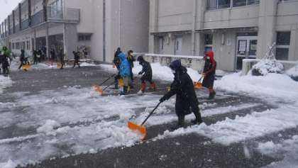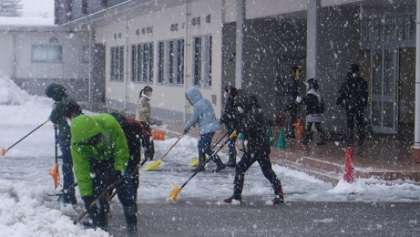 昨日、玄関で子供たちを迎えていると、まず、6年生担任がスコップを持って、雪かきを始めました。それに続くように6年生の子供たちがどんどん出てきて雪かきを始めました。子供たちの数はどんどん増えていき、みんなが一生懸命作業をするので、みるみる玄関付近の雪はなくなり、アスファルトが見える状態になりました。