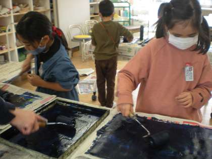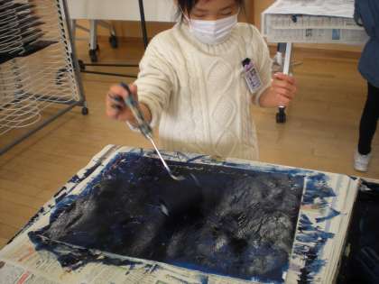図画工作科で、ローラー版画に挑戦しています。ローラーでカラフルな模様を付けた台紙に、動物や乗り物等、思い思いの形を作ってシールで貼りました。今日は、その上に藍色を塗りました。乾いてシールをはがすと、どんな作品になるのか楽しみです。