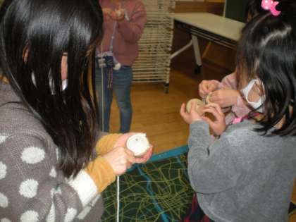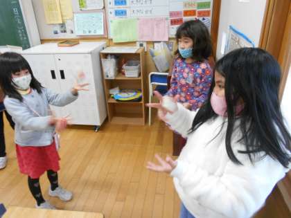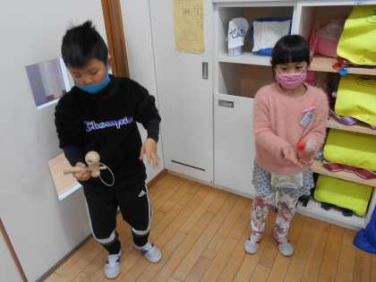 生活科の学習で、昔の遊びをしています。遊び方のコツを伝え合ったり、遊び方を工夫したりして、昔の遊びに親しんでいます。