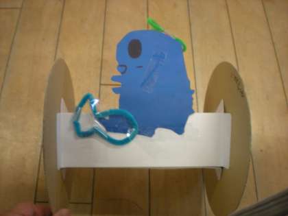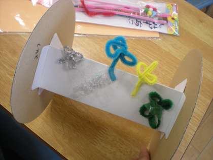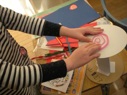 図画工作科で、車輪のように転がる仕組みをつくり、それに飾りを付けました。色紙やモールなどを使って軸の部分や両側の丸い部分に思い思いの飾りを付けていきました。「飾っては回す」「回しては飾る」を繰り返しながら、回すと楽しい飾りづくりに夢中になって取り組んでいました。