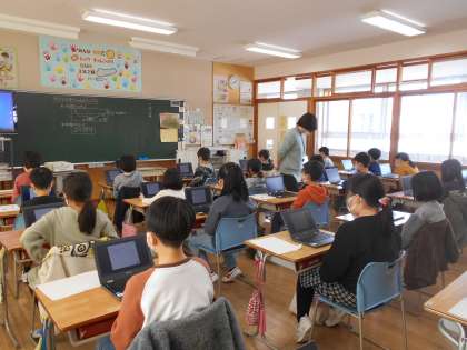 子供たちは先日、タブレット端末を使用しました。初めての端末に子供たちはわくわくしながら、一人一人大事に端末を扱っています。