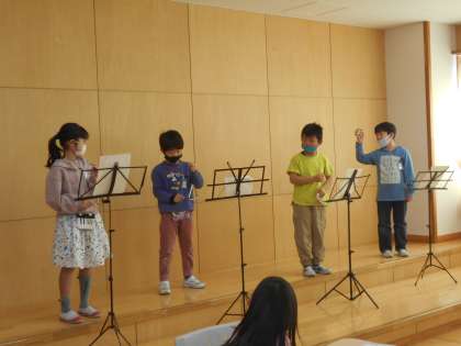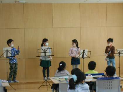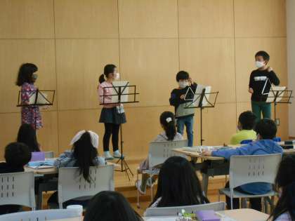 音楽科の学習で、音楽作りをしています。星空の様子を思い浮かべて作った音楽を、発表しました。強弱やリズムに工夫を凝らし、すずやトライアングルを使って移り変わる星空の様子を表しました。