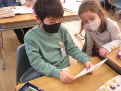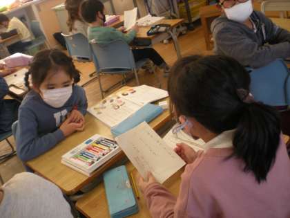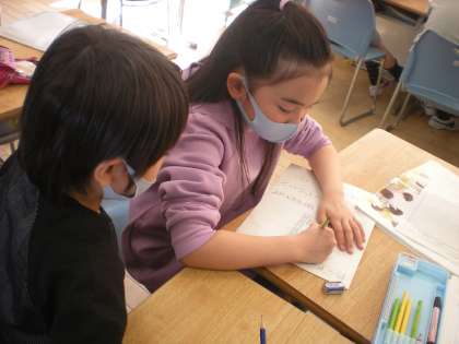 国語科で、学校にある物を答えにして、それを当ててもらう問題づくりを行いました。ペアでピントになる言葉をたくさん考えました。「どんなヒントが、いいかな」「すぐに分かるヒントも全く分からないヒントもよくないね」二人で相談しながら、二つのヒントを選んだり、出す順番を考えたりしました。