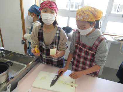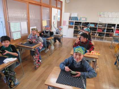家庭科の授業では、調理実習で、煮干しから出汁を取り、大根、葱、油揚げを入れて味噌汁をつくりました。出汁の風味や旨味を感じながら、みんなでつくった味噌汁は、とてもおいしかったようです。2学期に作成したランチョンマットを使っていただきました。