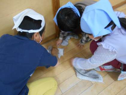 5時間目は、ワックスがけにむけて、教室の机を廊下に出して掃除をしました。普段は見付けられない隅の汚れや床の黒ずみを見付けて、一生懸命拭きました。「全集中、水拭きの呼吸!」で、1年間使った教室をぴかぴかにしました。