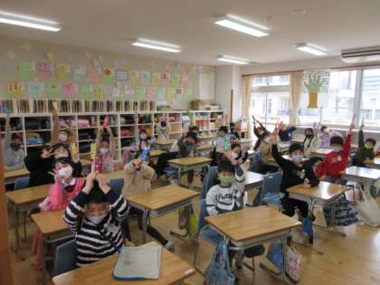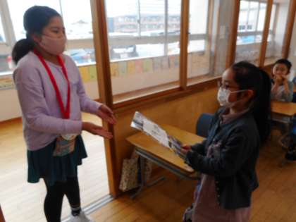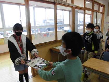 卒業おめでとう集会では、出し物のお礼として6年生さんが素敵な歌としおりをプレゼントしてくれました。自分の出番以外は、集会の様子を教室のテレビで見ていたので、教室まで6年生さんがしおりを届けに来てくれた時はうれしさと驚きでいっぱいでした。名前入りの素敵なしおりをもらって、大喜びの子供たちでした!