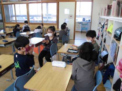 先日は、最後の聴き合い活動でした。ペアで「すきすきトーク」をしました。この日の話題は「春」に関すること。子供たちは、公園で遊ぶことや桜のお花見をすることなど、思い思いの話をしていました。友達の話に耳を傾け、「そうなんだ」「〜さんは○○が好きなんだね」と返したり、さらに話を続けたりするなど、1年間の活動の成果を感じました。この活動で学んだことを様々な機会に生かしてほしいです。