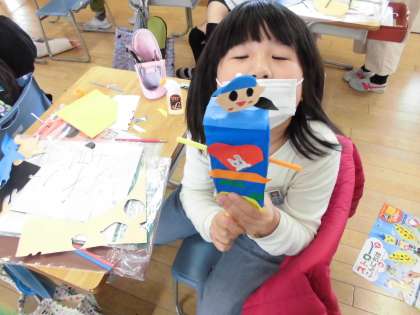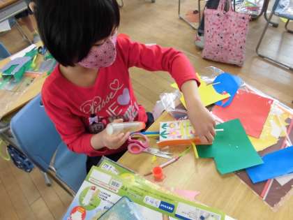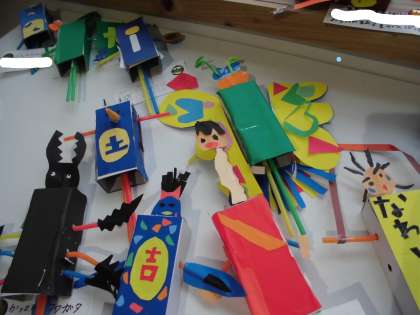 ストローで動くかわいいおもちゃを作りました。イルカやペンギン、ろくろっ首やくわがた等、楽しい作品がそろいました。子供たちは、「どうしたら動くようになるかなあ」「どこに飾りを付けたらその生き物らしくなるかなあ」と工夫をしながら、楽しんで作っていました。
