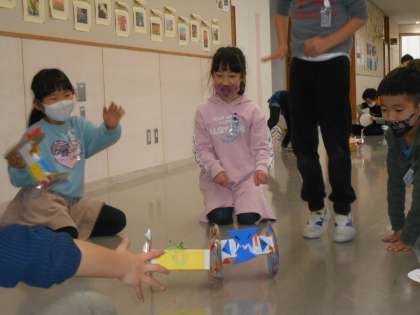 図画工作科の学習で、「紙皿コロコロ」の学習をしています。転がしたときに面白くなる飾りや模様を考えて、工夫して作りました。今日は、自分の作品を転がして見せたり、友達の作品が転がる様子を見たりしました。いろいろな動きをする車輪に、わくわくしている子供たちでした。