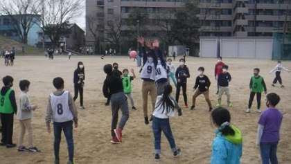 2組は、小幡先生も混ざって、みんなでドッジボールをしていました。先生の投げるボールに対して、子供たちはバレーボールばりのブロックで対抗。長身の二人がジャンプしても小幡先生にかないませんでした。