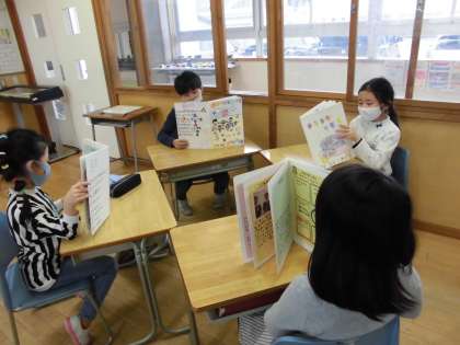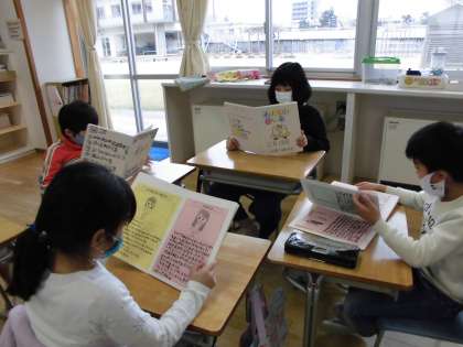 3学期に取り組んできた生活科「明日へジャンプ」の学習。今までの成長の足跡を絵本にまとめました。家族のみなさんに取材して、生まれたときのことや幼少の頃、保育園の頃のことを調べたり、入学してからのことを思い出して書いたりしました。完成した絵本を読み合い、「友達の小さい頃のことを読んで、みんないろんなことがあったんだなあ」「家族の皆さんにお世話になったね」「ぼくたちはいろんなことができるようになったね」と、感想を言い合っていました。保護者の皆様、ご協力ありがとうございました!
