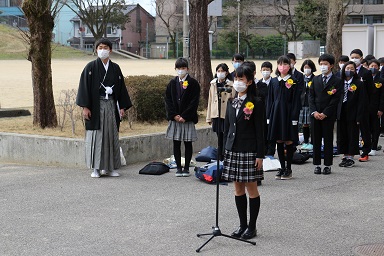 卒業式も終わり、正面玄関前で最後のお別れ、「お別れのつどい」を行いました。卒業生代表の言葉、卒業生からの万歳三唱ともに、とても立派でした。最後に校長先生から卒業生、東部校区に向けての万歳三唱がありました。
