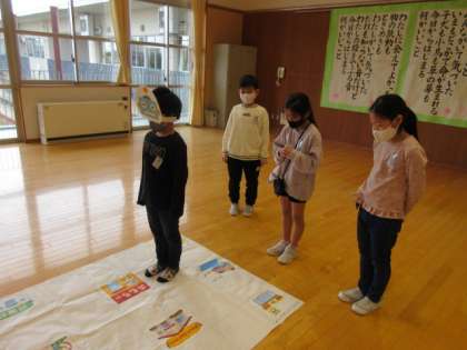 プログラミングの学習では、プログラマーとロボットに変身しました。プログラマーは、目的地に辿り着くための方向と歩数を考え、ロボットはプログラマーの指示通りに動き、お助けマンは指示通りに動いているか確認しました。「右から進んだ方がいいよ」「勝手に方向を変えないよ」など、対話をしながらどのグループも目的地に到着することができ、にこにこ笑顔な子供たちでした。
