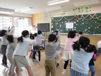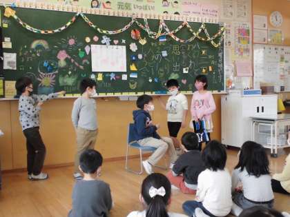 今日は、最後のお楽しみ集会をしました。集会の計画、準備、今日の本番まで子供たちの手で頑張りました。みんなでゲームを楽しんだり、転出する友達にインタビューしたりするなどし、大いに盛り上がりました。最後に3年生への抱負をみんなで言い、会を終わりました。楽しかったね、2年生!