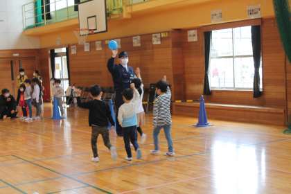 強風の中、体育館で1年生児童と10名を超えるPTAの皆さんの参加
