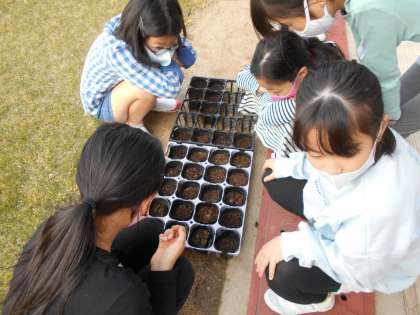 理科の学習で植物を育てます。小さな種を虫眼鏡でじっくりと観察して、種まきをしました。毎朝芽が出ていないかみんなでチェックしています。