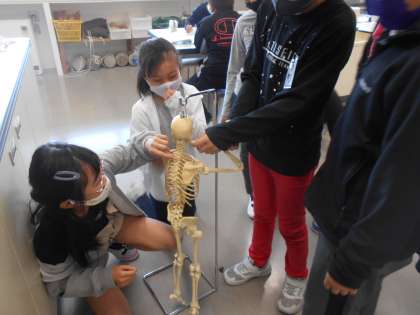子供たちは体のつくりについて調べています。今日は自分の体の骨や筋肉、関節がどのように体の中で繋がっているかを、人体模型を見たり、自分の体を触って確かめたりしながら観察しました。
