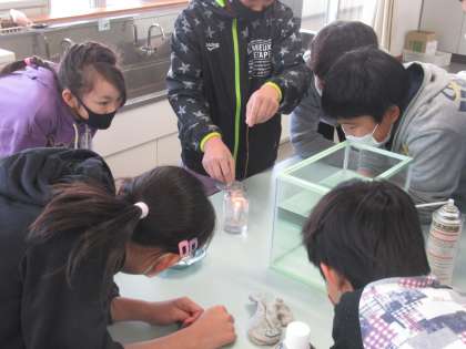 理科の授業では、物の燃え方について学習しています。実験で、窒素、酸素、二酸化炭素のうち、どの気体に物を燃やすはたらきがあるかを調べました。子供たちは、集気びんの中でろうそくの火が燃える様子をじっくり観察していました。