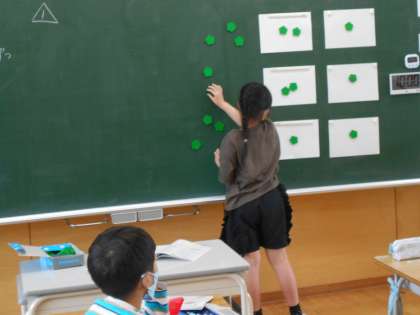 算数では、わり算の学習をしています。クッキーやゼリーの分け方をおはじきを使って考えました。