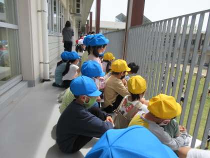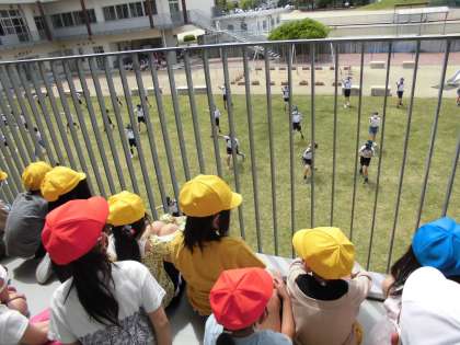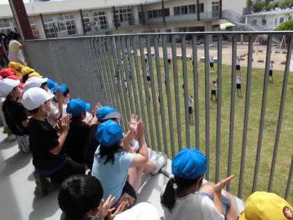 今日ののびのびタイムに、5、6年生の応援合戦の発表がありました。運動会当日は、応援合戦に参加できませんが、一緒に手拍子をしたり、自分の団の応援歌を歌ったりして、一緒に応援をしました。
