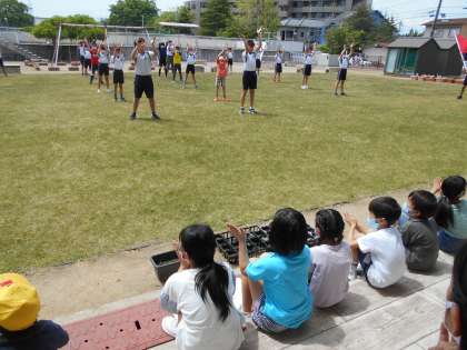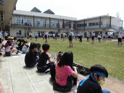 大休憩に高学年の応援合戦を見せてもらいました。一緒に応援歌を歌ったり、手拍子をしたりしていました。「高学年かっこいい!」、「わたしもあんな風に応援したいな」と高学年の格好いい姿を見ていました。