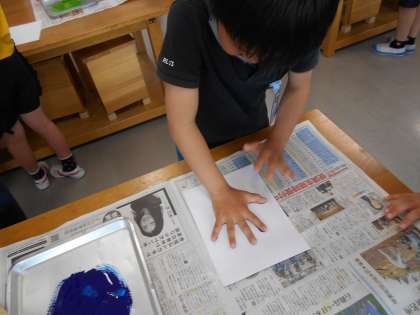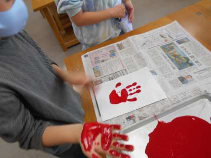 教室に掲示する学級目標の回りに飾る手形を作りました。手の平いっぱいにつく絵の具の感触を楽しみながら、友達と手形を見せ合っていました。きれいな色の手形でいっぱいの学級目標の完成が楽しみです。