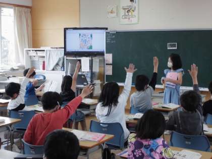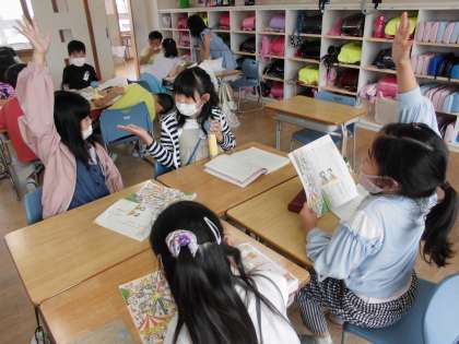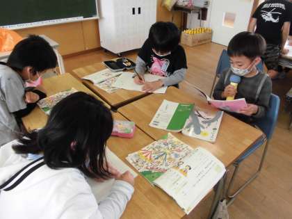 国語科で「ともだちをさがそう」の学習をしています。絵の中の子供の特徴を捉えて「まいごのお知らせ」を作り、みんなに話しました。聞く人は、大事なことを落とさないようにメモをしながら集中して聞きました。