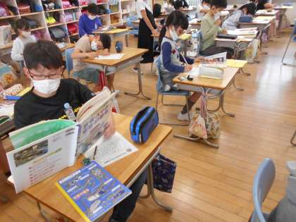 総合的な学習が本格的に始まりました。今年度は環境問題のことについて調べています。子供たちは、図書室にある環境についての本を熱心に読んでいました。