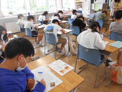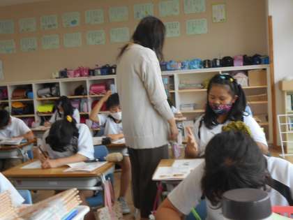 子供たちは硬筆の学習も進めています。今回は正しい鉛筆の持ち方でひらがなとカタカナを丁寧に書いていました。途中、腕や手の体操をしながら、真剣に書写に取り組みました。