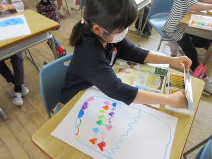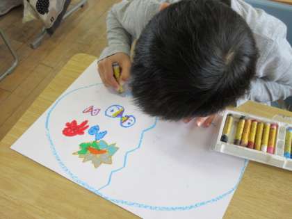 たまごの絵を描きました。花模様のたまご、海の世界のたまご、虹色のたまごなどすきなものをたまごの模様にしました。子供たちは、描いたたまごが割れると、中から何が出てくるのか想像を膨らませていました。