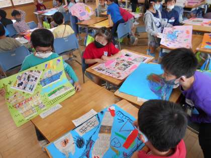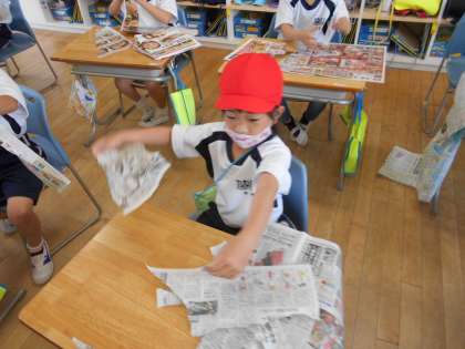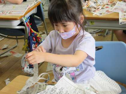新聞紙やチラシをビリビリやぶいた形から、なにに見えるか考えました。