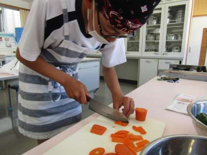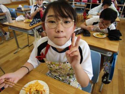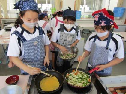 今日は2組が調理実習を行いました。「いろどりいため」と「スクランブルエッグ」を作りました。子供たちは、野菜と卵の火の通り方の違いに「玉ねぎはもう火が通ったけど、人参が固いままだな」「卵があっという間に固まっちゃった」と話していました。