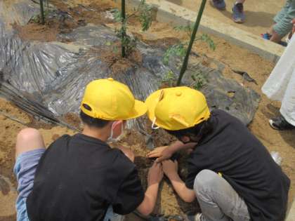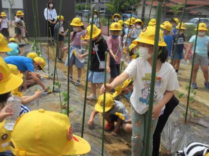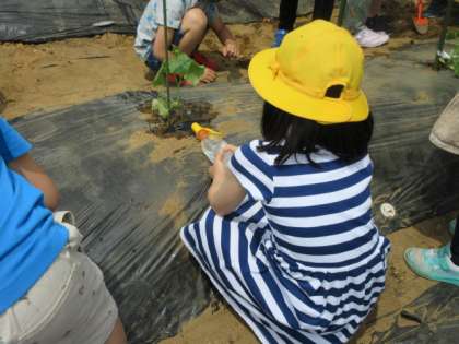みんなで育てる野菜の苗に支柱を立てました。「これで風が吹いても倒れないね」「水をたっぷりあげないとしおれているよ」「水をあげてもすぐに流れてしまうね」「苗のまわりを少し低くしたらいいのかな」子供たちは、友達と声をかけながらお世話をしていました。