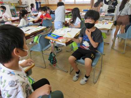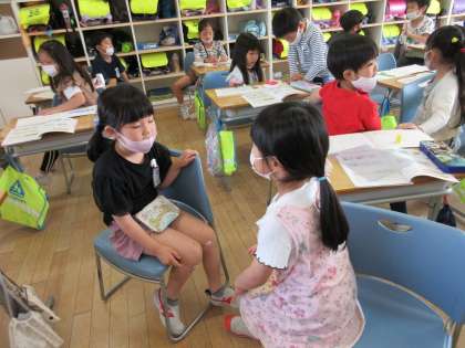 今、たし算の学習を進めていますが、今日は、たし算になる場面をペアでお話ししました。二人で仲良く楽しく学習しました。